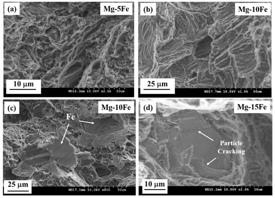 Fractography of tensile tested samples (Figure 7) indicates the failure mode of samples. Dominant ductile fracture features were observed in Mg-5Fe (Figure 7a), which showed high ductility (Figure 5). Mixed mode fracture with ductile and brittle features was observed for Mg-10Fe (Figure 7b). Fe particles remained intact in the Mg matrix, and debonding from the Mg matrix was not observed for composites (e.g., Mg-10Fe, Figure 7c). In Mg-15Fe, particle cracking was observed, with dominant brittle fracture features (Figure 7d).