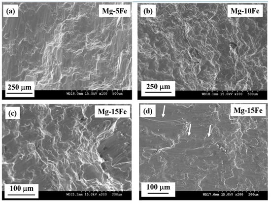 SEM micrographs of fractured compression test samples are shown in Figure 8a–d. For all the samples, fracture occurred at ~45° angle with respect to the compression test axis. The presence of shear bands indicates that all composites experienced shear failure. Mg-10Fe and Mg-15Fe (Figure 8b,c) show rough fracture surfaces with a mixed mode of shear and brittle features. Scoring marks on Mg-15Fe (shown by arrows) caused by Fe particle clusters during matrix shearing can be seen in Figure 8d.