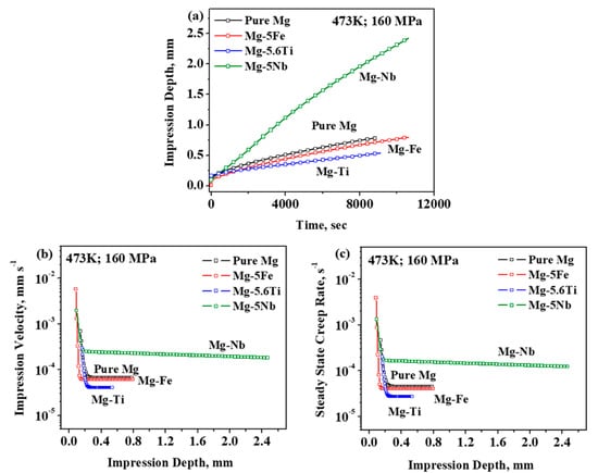 Impression creep curves of Mg-5Fe at 160 MPa and at 473 K are shown in Figure 9. The figure also shows creep curves for pure Mg, Mg-5.6Ti, and Mg-5Nb. Impression depth as a function of time is shown for the materials in Figure 9a. These materials experience primary creep, i.e., an increase in creep with time, followed by secondary creep, wherein their creep reached steady state. Fracture of samples (i.e., tertiary creep) does not occur in impression creep tests. During the creep process, materials experience work hardening and recovery []. Steady state is attained when an equilibrium is reached between these two competing mechanisms []. As can be seen from Figure 9a, the impression depth with respect to time is relatively lower for Mg-5Fe than that of pure Mg. Furthermore, Mg-Ti has the least penetration depth, and Mg-Nb has the highest penetration depth.
