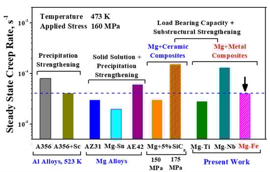Figure 10 shows steady state creep rate values of Mg-5Fe (shown by arrow) in comparison with those of Mg-5.6 Ti, Mg-5Nb, Mg alloys (AZ31, Mg-5Sn, AE42 [,]), Mg composites with ceramic reinforcements (Mg-SiC []), and Al alloys (A356, A356 + Sc []). Data for Mg alloys, Mg composites with ceramic reinforcements, and Al alloys were referred to from published reports. The data referred to for these materials are from impression creep tests conducted at the same temperature and stress as used in the present work (473 K; 160 MPa). Dominant creep strengthening mechanisms for the different material systems are mentioned in the figure.
