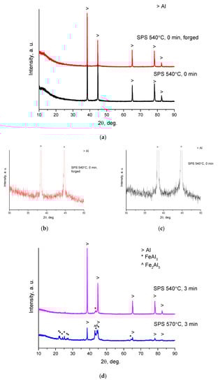Figure 2 shows the XRD patterns of the sintered composites. As seen in Figure 2a, reflections of aluminum are present in the patterns of composites obtained by SPS at 540 °C without holding and SPS followed by forging. No reflections of the reaction products between the metallic glass and aluminum are observed. Enlarged portions of the XRD patterns (35–50°, 2θ) are shown in Figure 2b,c. A diffraction halo between 40° and 50° overlapping with a reflection of aluminum indicates the presence of an amorphous phase in the sintered material. Therefore, in these composites, the glass phase of the Fe-based alloy was preserved after consolidation.