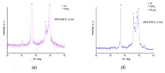 In the pattern of the sample held for 3 min at 540 °C, a broad reflection belonging to the FeAl3 phase appears (Figure 2d). Reflections of FeAl3 are much more pronounced in the pattern of the sample sintered at 570 °C for 3 min. Along with reflections of FeAl3, those of Fe2Al5 are detected. In the enlarged portions of the XRD patterns (Figure 2e,f), a diffraction halo can also be distinguished (overlapping with reflections of the crystalline phases), pointing to the presence of an amorphous phase in the sintered composites, possibly in reduced concentrations relative to composites sintered at 540 °C.