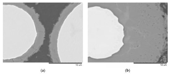The microstructure of the material sintered at 540 °C without holding and that obtained by SPS/forging are similar (Figure 3a,b). No reaction layer is seen at the interface between the matrix and the reinforcement. The spherical particles of the Fe-based alloy do not show any grain boundary structure, which agrees with results of the XRD analysis of these samples. Holding of the sample at 540 °C for 3 min resulted in the growth of the reaction product layer around the spherical particles of the alloy (Figure 3c and enlarged image in Figure 4a). After sintering at 570 °C for 3 min, the layer grew even further (Figure 3d and enlarged image in Figure 4b).