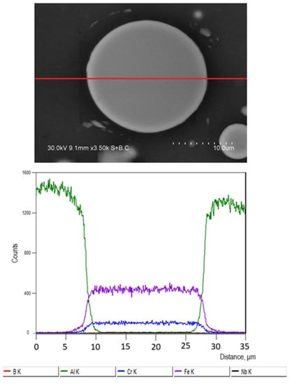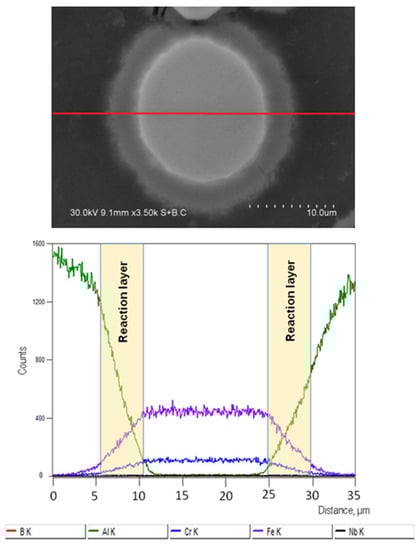 The EDS profiles show that, in the composite sintered at 540 °C without holding, the concentrations of Al, Fe, and Cr change rapidly with distance when the particle/matrix boundary is crossed (Figure 5). The product layer formed after sintering at 540 °C for 3 min has a gradient structure (Figure 6). If extrapolated, the Fe and Cr downhill lines corresponding to the reaction product layer intersect the x-axis almost at the same point, so the ratio of the Fe and Cr concentrations in this layer remains constant. Guan et al. [] used transmission electron microscopy to study the structure of the interfacial layers in composites consolidated from Al-Fe50Cr25Mo9C13B3 mixtures. Three areas were detected: amorphous regions containing diffused Al atoms, crystallized regions containing Al atoms, and FeAl3 intermetallic.