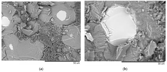 The composite sintered at 570 °C for 3 min featured a thick reaction product layer and contained only 37 vol.% of residual aluminum (Table 1). This material showed a high compressive strength (790 MPa) and a fracture strain of 2%. The product of the interaction between aluminum and the metallic glass (FeAl3) acts as a reinforcing element via a load transfer mechanism, contributing to an increased strength of the composite. The fracture surface of this composite shows areas of the Fe-based alloy particles (bright areas) and reaction product layer (light-gray areas), which fracture in the brittle mode (Figure 8a). Areas of the matrix (dark-gray areas) showed a dimple fracture surface (Figure 8a). A higher magnification image of a Fe-based alloy particle surrounded by a layer of the reaction products is presented in Figure 8b. Noteworthy is the absence of debonding at the Fe-based alloy particle/reaction product interface. The Fe-based alloy particles were not pulled out of the matrix. Rather, they experienced fracture, which indicates strong bonding at the interface. The cores of the reinforcing particles show fracture surface morphologies that are characteristic to amorphous materials.