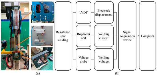 Experimental setup. (a) Spot welding system including servo gun. (b) Schematic diagram of the monitoring system for the resistance spot welding process.