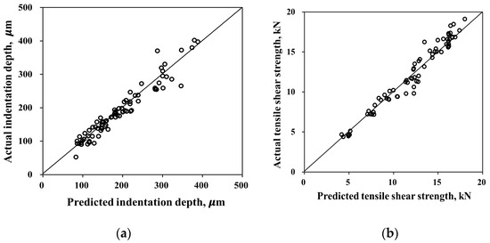 Comparison between the predicted value and the measured value: (a) indentation depth; (b) tensile shear strength.