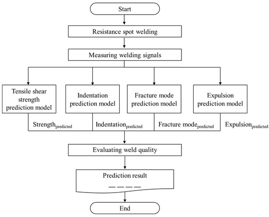 Resistance spot welding is the main joining method used in the assembly of automobile parts. This technique has the advantage of high productivity compared to other welding processes. As the welded parts used in car bodies directly affect the stiffness and collision safety of the vehicles, it is important to improve the quality and maintain the uniformity of the weld. The tensile shear strength, indentation depth, expulsion occurrence, and failure mode are properties of a welded joint that affect the quality of welded parts [1,2,3,4]. Therefore, a quality inspection of these properties should be performed after the resistance spot welding process. The quality requirements of a welded joint are evaluated either using non-destructive testing (NDT) or destructive testing (DT). NDT is generally performed through visual inspection and ultrasonic inspection of assembly lines [5,6,7]. These NDT methods require an additional inspection process because they involve direct measurement or inspection by an operator. This leads to reduced productivity and requires a considerable amount of time. Quality inspection metrics such as the strength and failure mode of the weld can be evaluated using the DT method [8]. However, DT quality inspection of finished products is not possible because the DT method must be carried out by destroying the finished products. Therefore, technological development is required to address these problems. Currently, quality inspection is performed using an NDT method, such as the analysis of the welding signal measured during the welding process. Although the NDT method based on dynamic resistance, power, current, voltage, and image data has been developed and applied, it is not widely applied in the field because there is a limit to its accuracy and therefore its ability to meet the requirements [5]. In addition, because most of the previous research on the NDT method has focused on inspecting only one or two weld quality metrics, a method that can predict the overall weld quality metrics, including tensile shear strength, indentation depth, expulsion occurrence, and failure mode, is an improvement.