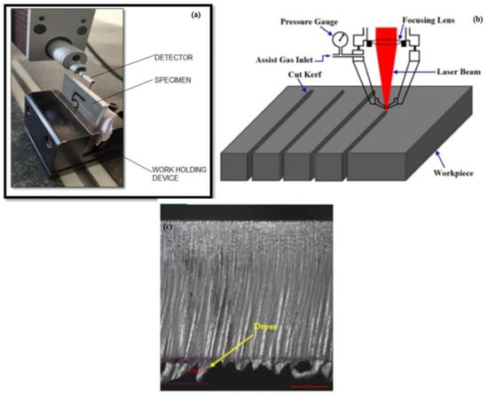 Surface roughness is a key parameter that defines the quality of the cut edge. The surface roughness was determined using the Surftest SJ-410 model (Mitutoyo, Ahmedabad, India). An enlarged view of the SR measurement is shown in Figure 1a. The arithmetic average roughness (Ra) value was measured from cut specimens in the current study. Ra is the arithmetic mean of the peaks and valleys of the surface from the centerline or mean line. The cutoff length λc was selected as 0.8 mm and the evaluation length was selected as 15 mm during the measurement. Kerf is the amount (width) of material removed from the material during the cutting process. Kerf width measurement was performed using the BX53 microscope (Olympus, Gandhinagar, India). Figure 1b shows the schematic of the kerf measurement. Dross refers to the molten material that is not excluded from the machining zone by gas flow that re-solidifies at the bottom part of the specimen. Dross measurement was performed with help of trinocular microscope MSZ-TR (Magnus, Gandhinagar, India), as shown in Figure 1c. The material removal rate was calculated as the ratio of the weight of the removed specimen to the machining time. In order to achieve higher productivity, MRR must be higher. MRR was measured in g/s, as per Equation (1):