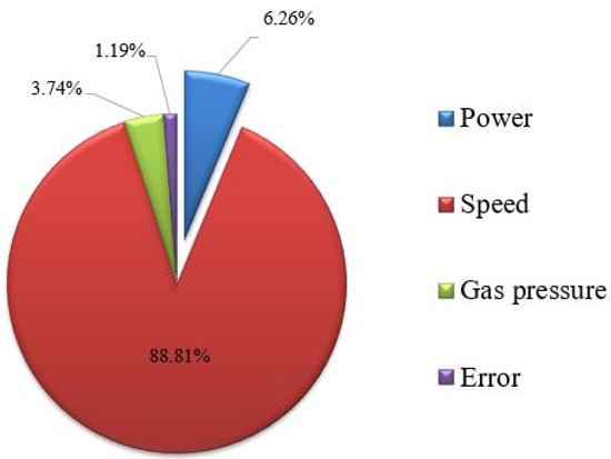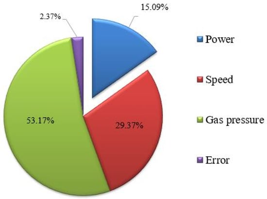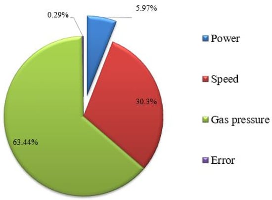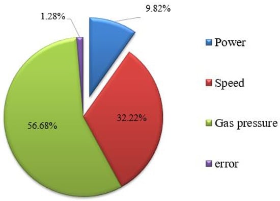 In order to achieve optimal quality, the lowest possible value of SR is desirable. The ANOVA technique was used to investigate the significance of the selected input variable. Table 4 shows the ANOVA table for SR. The significance of the input variables was determined on the basis of the F-value or the p-value. ANOVA analysis was conducted at a 95% confidence level. At a 95% confidence level, the p-value should be less than 0.05 to indicate that it has a significant effect on the selected response []. Table 4 shows that all of the machining parameters have a significant impact on SR, as the p-values for laser power, speed, and gas pressure were found to be 0.045, 0.009, and 0.004, respectively. The difference of less than 20% between the values of R-sq. and Adjusted (Adj.) R-sq. indicates that the existing model is suitable [,]. The R-sq. and Adj. R-sq. values for SR suggest that the model is able to provide the best fit for the existing data. The ANOVA results show that the contribution of gas pressure was the highest, at 63.44%, followed by cutting speed, with 30.3% contribution, and laser power, with 5.97% contribution. A negligible error contribution of 0.29% was observed, indicating that the present study could be effectively used as a basis for future predictions. Figure 2 shows a pie chart of the percentage contribution of machining variables for SR. The standard deviation for SR was observed to be 0.1226. This indicates that the maximum deviation from the mean value of SR is only 0.1226.