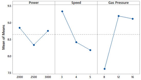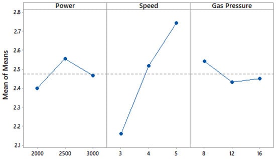 The impact of machining variables on SR on the basis of the main effect plot is shown in Figure 3. Main effect plots indicate the mean response of each level of the factors connected by the line. The Y-axis of the plot represents the mean of the means, i.e., the range of SR values obtained for different levels of the input machining parameters. It can be observed that increasing power results in a decrease in SR values, while a further increase in power results in increasing SR values. This is due to the heating supply in the machining zone. With a lower level of heat supply, the melted material has a higher viscosity and is not easily excluded from the machining zone []. However, at higher levels of heat supply, the higher temperature gradient may result in more molten material [] and, as a result, the removal of the molten material from the cutting zone, thereby affecting the surface quality. Increasing cutting speed resulted in lower values of SR, which can mainly be attributed to the shorter exposure periods of the laser beam on the specimen [,]. An increase in SR was observed with increasing values of gas pressure. Increasing gas pressure generated more peaks and valleys in the cutting region, which in turn led to increased values of SR [].