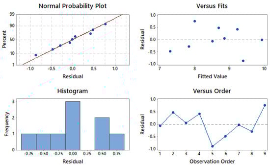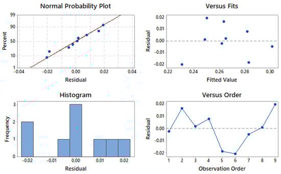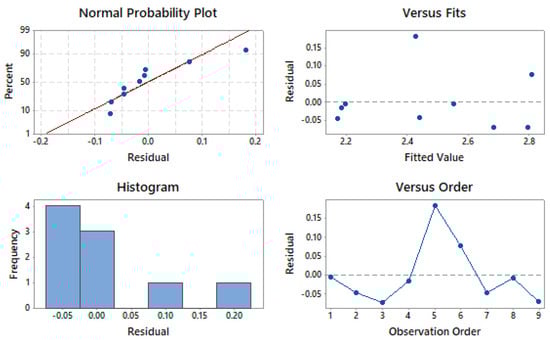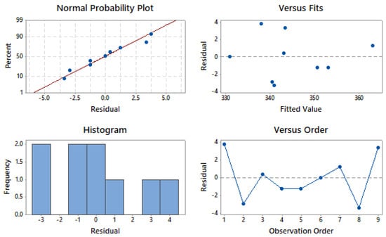 Figure 4 shows the residual plots for SR. Residual plots are important for verifying the ANOVA results []. The given four-in-one residual plots include a normal probability plot, a residual vs. fitted value plot, a histogram, and a residual vs. observation order plot. In the normality test, a straight line is formed by all of the residuals, as shown in Figure 4. It can be concluded that there is no residual clustering, and that these are all distributed normally. In the residual versus fitted plot, the allocation of all the residuals is random, which is a good method of statistical analysis for ANOVA. In the histogram plot, a parabolic structure can be observed, which supports the normality of the data. In the residual versus fitted plot, the absence of any pattern indicates the fitness of the ANOVA results. This verifies that all four tests confirm the satisfactory nature of future outcomes of the proposed model.