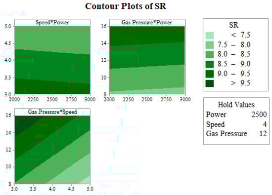 The influences of two simultaneous input variables (determined by keeping the third input variable constant) on SR were determined on the basis of the contour plots. Figure 5 shows the contour plots for SR. In the contour plot for speed and power, the horizontal axis represents power, and the vertical axis represents speed. This contour plot was generated by maintaining the value of gas pressure constant at the middle level (12 bar). The range of SR, which varied from 7.5 to 9.5 μm, is depicted using different colors in Figure 5. The lowest value of SR (<7.5 μm) was obtained by keeping the cutting speed in the range of 4.5 to 5 m/min, and with any value of laser power (between 2000 to 3000 W). The reason for this is that the higher cutting speed results in insufficient exposure of the specimen to the laser beam. The contour plot of gas pressure and power was generated by holding the cutting speed value at the middle level (4 m/min). The minimum value of SR (<7.5 μm) can be obtained when the gas pressure is around 8 bar, and for any value of laser power (between 2000 to 3000 W). In the contour plot of gas pressure and speed, the laser power was kept at a constant value of 2500 W. The lowest SR can be achieved at the lowest value of gas pressure and the maximum value of cutting speed used in the current study.