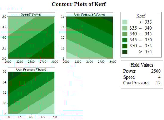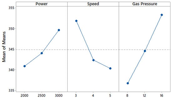 Figure 7 shows the main effect plot for kerf width. The main effect plot of power vs. kerf shows an increase in the value of kerf width with increasing power. With higher heat supply to the machining zone, radial transfer of heat takes place in the material. Because of this higher energy, more material is vaporized from the cut edge, resulting in a wider kerf width []. A continuous decrement in kerf width was observed with increasing cutting speed. This was due to fact that the energy input at the cutting zone decreases with higher travel speed of the laser source []. An increase in the value of kerf width can be seen in Figure 7 with increasing gas pressure. Higher gas pressure creates greater force on the molten material, which increases the material removal rate [].
