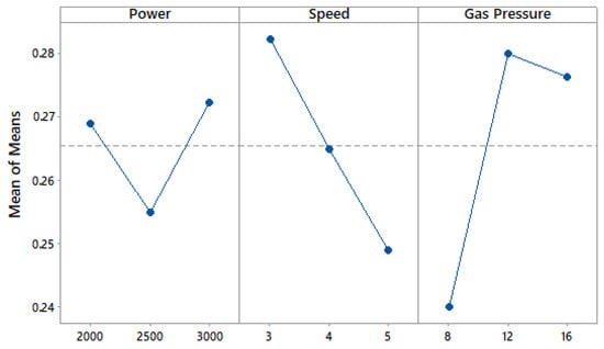 Figure 15 shows the main effect plot for MRR. The initial increase in laser power resulted in an increase in MRR, while a further increment in power resulted in lower MRR. Heat supply to the machining zone increases with increasing power, which in turn results in material melting in a shorter time, which in turn increases MRR []. At the highest laser power, more material is melted in the machining zone. This melted material is removed from the work specimen, resulting in lower values of MRR at higher values of laser power []. A continuous increase in MRR was observed with increasing cutting speed. MRR is largely dependent on cutting speed. The main effect plot for gas pressure showed no significant effect on MRR.