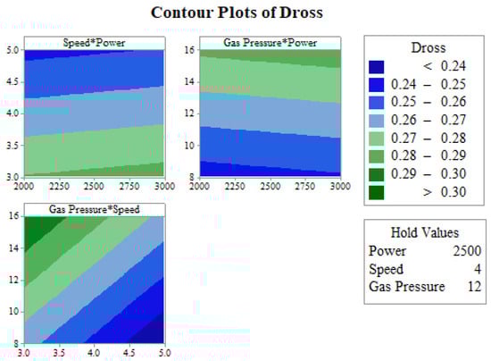 The influences of two simultaneous input variables (by keeping the third input variable constant) on dross height were determined with the help of contour plots. Figure 13 shows the contour plot for dross height. The contour plot of speed and power was generated by holding the gas pressure value constant at 12 bar. The range of dross height was varied from 0.24 to 0.30 mm. The lowest value of dross (<0.24 mm) was obtained with a maximum cutting speed of 5 m/min along with a laser power in the range of 2000 to 2500 W. The contour plot of gas pressure and power was generated by holding the cutting speed value at the middle level (4 m/min). A minimum value of dross height (<0.24 mm) was obtained with a minimum gas pressure of around 8 bar and any value of laser power (between 2000 and 3000 W). In the contour plot of gas pressure and speed, the laser power was kept at a constant value of 2500 W. The lowest dross height was obtained at the maximum value of cutting speed and the lowest value of gas pressure.