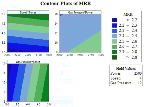 Figure 17 shows the contour plot of MRR. The effects of two simultaneous machining variables were studied by holding the third input variable constant with respect to MRR. In the contour plot of speed and power, a constant gas pressure value of 12 bar was used. The range of MRR obtained for the given levels of the machining variables ranged from 2.2 to 2.8 g/s. The maximum MRR (>2.8 g/s) was attained at a higher cutting speed along with any value of laser power in the range of 2000 to 3000 W. Regarding the contour plot of gas pressure and power, a maximum MRR of about 2.6 g/s was obtained at higher power and lower gas pressure. Regarding the simultaneous effect of gas pressure and speed with a constant laser power of 2500 W, a maximum MRR (>2.8 g/s) could be achieved when maintaining a higher cutting speed of between 4.5 and 5 m/min along with any value of gas pressure between 8 and 16 bar.