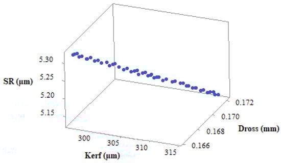 3D and 2D plots were prepared using non-dominant optimal Pareto points, as shown in Table 9. As the minimum values of SR, kerf, and dross are desirable for the laser machining of Ti6Al4V, a 3D plot for these three output response variables was generated, as shown in Figure 19. In the 3D Pareto plot, the X-axis represents the kerf values, the Y-axis represents the dross values, and the Z-axis represents the SR values. However, the values represented in the 3D plots include the effect of the remaining output response variables, i.e., MRR. Each point represented on the 3D Pareto curve gives a unique solution, with its own corresponding input process parameters. The operator can select any Pareto point on the curve, depending on the required values of output responses, to obtain the corresponding values of input process parameters that can be used for machining.