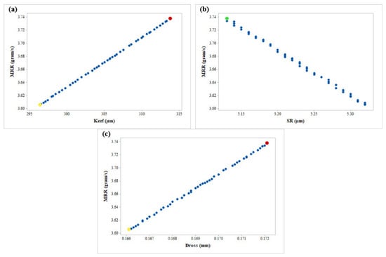 By considering the need for industrial users/operators, 2D plots were also generated. Figure 20a–c show three different 2D plots, corresponding to MRR vs. kerf, MRR vs. SR, and MRR vs. dross. However, the values presented in these 2D plots include the effect of the other two response variables. 2D Pareto curves are more useful when the other two response variables are not desirable for the users. Figure 20a represents the 2D Pareto curve of MRR vs. kerf, in which the X-axis represents the kerf values and the Y-axis represents the MRR values. The machining parameter corresponding to the red point mentioned on the curve indicates that the maximum MRR can be achieved under this machining condition. However, at the same time, the kerf value will be increased, which is not desirable. A similar situation can be observed for the machining parameters, represented by a yellow point, which can provide the desired minimum kerf value, while resulting in decreased values of MRR, which is not desirable. Therefore, the operator can select any optimal point of the curve on the basis of the required values of MRR and kerf. Figure 20b shows the 2D Pareto curve of MRR vs. SR, in which the X-axis represents the SR values and the Y-axis represents the MRR values. The green point on the curve describes the machining conditions under which the desired higher MRR and lower SR can be achieved simultaneously. Figure 20c shows the 2D Pareto curve of MRR vs. dross. The selection of the Pareto point for maximum MRR will result in a higher value of dross (represented by the red point). On the other hand, the Pareto point for lower dross will also result in a decreased value of MRR (represented by the yellow point). Therefore, again depending on the required values of MRR and dross, the optimal point on the curve can be selected, which provides the corresponding machining variables.