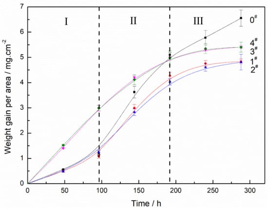 Corrosion behavior (weight gain per unit area in early (Ⅰ), middle (Ⅱ), and late (Ⅲ) corrosion stage) of Cu-bearing steels.