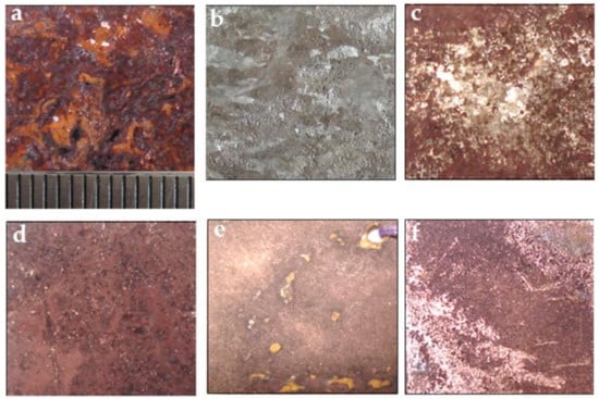 Before descaling, there is a thick rust layer on the steel surface, and a typical macro-photograph is shown in Figure 5a. After descaling, the rusts had obviously been removed, as shown in Figure 5b–f. With the increasing of copper content in steel, the copper on the steel surface becomes more and more obvious after rust removal. In order to show the copper layer on the surface of steel 4, the corners of rust removal surface were partially ground with sandpaper as shown in Figure 5f, which shows that the copper layer on the steel surface is dense and closely combined with the matrix.