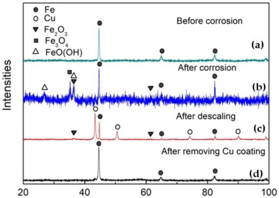 In order to confirm the presence of a pure metallic Cu coating, the XRD analysis results for steel 2 at different stages are shown in Figure 6. Before corrosion, the original material is iron (Figure 6a), where copper should act as solid solution atoms. After corrosion, the surface of steel 2 is covered with a thick rust layer consisting of Fe2O3, Fe3O4, Fe, and FeO(OH), which may include α-FeOOH, γ-FeOOH, and amorphous ferric oxyhydroxide (FeOx(OH)3-2x, x = 0–1) [17,18]. There is little copper or copper oxide present, because these cannot be detected by XRD, as shown in Figure 6b. After descaling, there is approximately 80% Cu and 20% Fe with a small amount of Fe2O3 left on the surface of steel 2, as shown in Figure 6c. These results agree well with that shown in Figure 4.