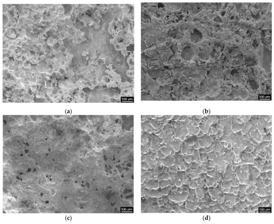 SEM (a) for steel 1, (b) for steel 2, (c) for steel 3, and (d) for steel 4 micrographs on steel surface after descaling.