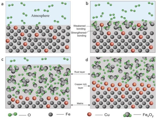 It is well known that the oxidation and corrosion rate of copper is relatively low compared to that of iron. Kondo [19] examined the distribution of copper in the scale of oxidized steel containing copper. The schematic diagram of corrosion and oxidation process of copper-bearing steel is shown in Figure 8. In the corrosion process, oxygen and other atoms tend to combine with iron atoms to form Fe2O3, Fe3O4 and other non-metallic corrosion products, while the combination of oxygen and copper requires higher energy and longer time. The combination of oxygen and iron atoms results in the increase of sample weight [20]. Meanwhile, the volume of the oxide layer expands with the increase of material weight, which indicates that the distance between the compound molecules in the oxide layer and the metal atoms in the matrix increases as shown in Figure 8b. As a result, the binding forces between iron atoms in the oxide molecule and those in the matrix are weakened, sometimes accompanied by some defects [21]. The appearance of defects is more conducive to the oxidation and movement of metal atoms.