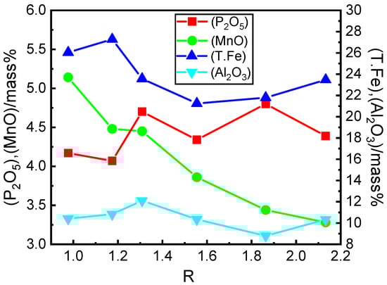 Figure 3 shows the effect of basicity on the P2O5, MnO, T.Fe, and Al2O3 contents in slag. With the increase of the basicity, the MnO content in slag decreases obviously, the P2O5 content increases slightly, the T.Fe content first decreases and then changes slightly, and the Al2O3 content changes little.