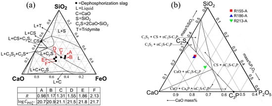 (a) Compositions of dephosphorization slags located in the CaO-SiO2-FeO ternary phase diagram; (b) compositions of the corresponding P-rich phases located in the CaO-SiO2-P2O5 ternary phase diagram.