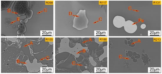 Combining Figure 5 and Figure 6, and Table 4, it can be seen that the phases in the slag of R098 and R117 are mainly composed of matrix phase C rich in P and Fe2SiO4 phase D. Besides, a small amount of spinel phase E rich in Al, Mg, Fe, and Mn was found in R098. However, the phases in slag of R131 are mainly composed of matrix phase C rich in P and a small amount of Fe phase containing pure iron.