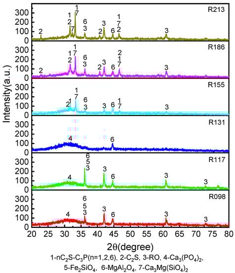 Figure 7 shows the XRD diffraction patterns of the dephosphorization slag with different basicities. The phase compositions of dephosphorization slag are basically the same at the basicities of 0.98 and 1.17, which are mainly composed of metal oxide phase (RO), Fe2SiO4, C3P, and MgAl2O4. When the basicity is increased to 1.31, the main phases in slag are C3P and MgAl2O4. This shows that when the basicity is lower than 1.31, the P in the slag mainly exists in the matrix phase in the form of C3P. At the basicities of 0.98 and 1.17, the Fe2SiO4 is formed in the quenched dephosphorization slag, which is completely consistent with the results in Figure 6 and Table 4.