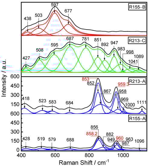 The two strongest Raman peaks of P-rich phase in dephosphorization slag mainly appear in the high-frequency region, which are near 850 cm−1 and 960 cm−1, respectively, as shown in Figure 8, R213-A and R155-A. In Table 4, the P-rich phase is mainly composed of nC2S-C3P and a small amount of metal oxides. Therefore, it can be preliminarily judged that the peaks in the high-frequency region are mainly the superposition of the peaks corresponding to [SiO4]-tetrahedron and [PO4]-tetrahedron.