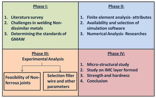 The research is organized into four stages. The challenges in welding non-ferrous DMW are recognized following a comprehensive literature review. The GMAW method is selected, and their variations can be utilized to overcome the challenges. Since the goal of most numerical simulation studies is to develop finite element models (FEMs) to solve real-world problems, adopting the latest software to carry out numerical analysis is a crucial part of every discipline. In the second phase, detailed availability and comparison of different simulation software, used specifically for simulating welding process, are discussed (Figure 1).