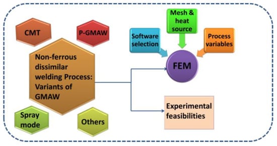 Dissimilar metals can be joined by conventional welding methods such as shielded metal arc welding, GMAW, submerged arc welding, flux-cored arc welding, electron beam welding (EBW) [], ultrasonic welding, friction stir welding [], laser beam welding [], and gas tungsten arc welding (GTAW). Although welding methods such as EBW and laser beam welding are suitable for joining dissimilar materials, they are inadmissible for small production industries because of their high cost and maintenance. Also, conventional GMAW causes considerable dimensional deformation and has difficulties in customizing and controlling heat input. Therefore, this study focuses on analyzing various aspects of advanced GMAW. In DMW, an advanced GMAW method provides a massive benefit. It is apparent that the different GMAW variants have a major impact on the characteristics of the joint. It also controls the width of the HAZ, the content of intermetallic layer, the microstructure, and therefore the technical effectiveness of the joint. Furthermore, when combined with an appropriate metal, improved controllability of advanced GMAW can improve ductility of IMC []. Despite the challenges, practical fusion welding methods for DMW have been ceaselessly explored []. Yet, the actual experimental welding process and physical testing will be extensive, laborious as well as horrendously overpriced. Because of this problem, the welding method necessitates the employment of advanced computational and modeling tools.