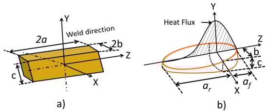 (a) Schematic of the rectangular heat source model; (b) double ellipsoidal heat source model, where a—length; b—half width; c—depth of penetration; af—front length of molten pool; ar—rear length of molten pool.