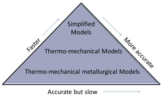 Whenever the moving heat source is employed in computations, the results are calculated using the “transient” approach, also known as the “step-by-step” method. The time taken to perform analysis can be default or modified by the operator, based on the mesh size and refinement of the design. Semi-ellipsoidal and Double–ellipsoidal heat source models were proposed by Goldak et al., 1984 [] as well as rectangular heat sources [] which are used in most current FEM models [] (Figure 4). The type of FEM selected determines the accuracy and time consumption of the analysis (Figure 5).