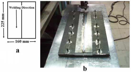 Representation of welding arrangement (a) Weld specimen dimension, (b) Clamping arrangement [] (from open access journal).