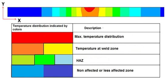 A study investigated the residual stress in the dissimilar joint from AISI 304 and Monel 400. The predicted residual stress distribution and thermal field (Figure 8) in a FEM model developed was performed in ANSYS. Solid 90 elements and a sequentially coupled thermomechanical transient method were used. They reported that the finite element three-dimensional heat source model effectively estimates the precision residual stresses in the weld zone. The predicted findings correlated with the experimental results, with only 5% defects []. Mostly, FEA analysis of welded components is typically performed to investigate the distortion and deformation of the component during the welding process.
