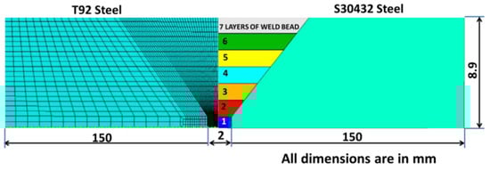 Meshing and layers of weld bead in a welded joint between two dissimilar steels, Modified from [] with permission from Elsevier.