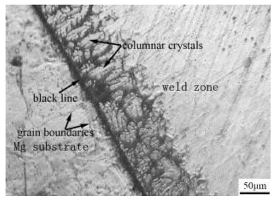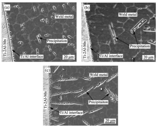 Microstructures of weld metal near the Ti-Al interface under different heat inputs: (a) 1.82–1.91 kJ/cm, (b) 1.90–1.99 kJ/cm, and (c) 2.05–2.14 kJ/cm []. Figure reused with the permission from Taylor & Francis Group.