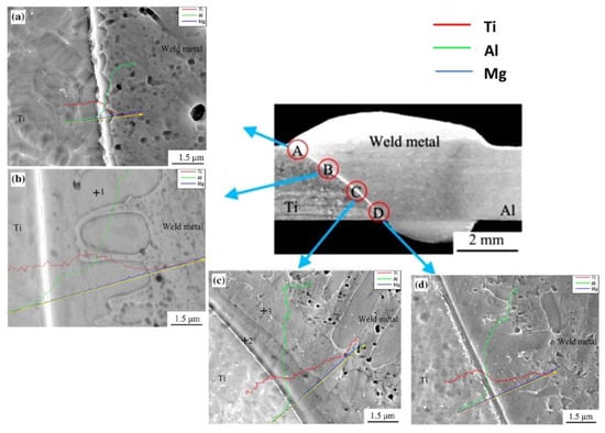 Ti-2Al-Mn alloy and aluminum 1060 plate was welded by Wei and his fellow researchers, using an AlSi5 filler wire by P-GMAW indicating a good weld. Under a scanning electron microscope, the joint formed by the controlled welding process was found to be free of pores and cracks. When aluminum and titanium are fusion-welded, IMCs such as TiAl3 and Ti2Al render the weld zone exceedingly brittle, thereby decreasing the mechanical properties of the joint. Despite its low density, TiAl3 exhibits high microhardness and high temperature and oxidation resistance. Wei et al. reported TiAl3, Ti7Al5Si12, and α-Ti in the HAZ [].