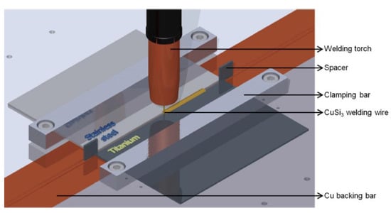 - Liu, H.; Cheng, Z.; Huang, J.; Ye, Z.; Yang, J.; Chen, S.; Zhao, X. Feasibility study of different filler metals on MIG-TIG double-sided arc brazing of titanium alloy-stainless steel. J. Manuf. Process. 2019, 47, 183–191. [Google Scholar] [CrossRef]