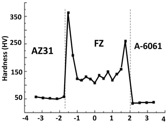 Generally, the process of preventing metal cracking during welding is termed as weldability []. Due to differences in mechanical, microstructural, and thermal characteristics, weldability varies by material. These material properties may cause cracking in the weld joint region, and also contribute to the creation of high-hardness weld zones due to a fast rate of solidification [], and may release of environmental gases such as Argon, nitrogen, carbon dioxide, carbon monoxide []. Therefore, a material with high weldability quality should be selected for welding to avoid different types of cracking, thereby avoiding repair or revamping. During the welding process, the heating phase considerably affects welded joints and their heat-affected zones (HAZ) by modifying their chemical configurations, micro and macro-structural characteristics, and physical properties. To avoid significant contrasts in the base metal, an appropriate welding technique should be chosen. Among the fusion joining processes, the most common process is electric arc welding, which is widely used in the welding of metals such as steel [,], aluminum [], titanium [], and magnesium alloys []. Unfortunately, welding these metals together in a dissimilar manner is highly complicated and challenging.