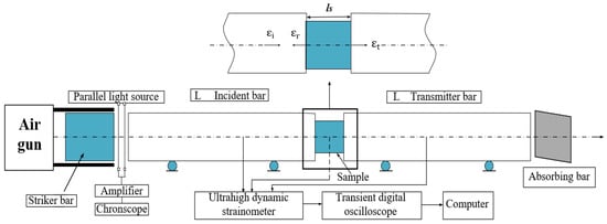The impact bar launched by the high-pressure air gun impacted the input bar axially and resulted in the formation of loading pulse, which propagated along the bar to the specimen. The specimen then deformed under the action of the pulse. Meanwhile, the reflection pulse was transmitted back to the incident bar, and the transmission pulse was transmitted to the transmission bar. The gauge at the center of the bar was used to record the strain. The incident, reflected, and transmitted signals were recorded on the oscilloscope in the form of voltage, and the voltage was converted to the actual incident , reflected and transmitted .