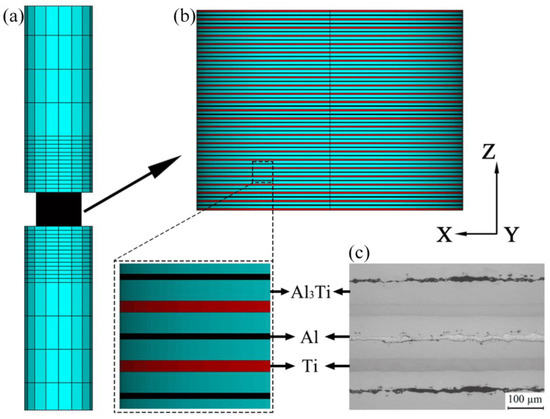 At present, scholars have researched into the mechanical properties of Ti–Al3Ti laminated composites, including: three-point bending [7,8], quasi-static compression [9,10], and anti-penetration performance [11,12,13,14,15,16,17], etc. Adharapurapu [18] et al., reported that the toughness and fatigue properties of Ti–Al3Ti laminated composites were improved obviously due to the bridging effect of ductile titanium. Cao [19] et al., through the combination of experiment and simulation, found that the damage modes of Ti–Al3Ti laminated composites include traverse cracks, crack deflection, and delamination, which enabled the composites to absorb more energy. Zhou [20] et al., found that the fracture modes of the Ti–Al3Ti interface in the composites varied as a function of strain rate.