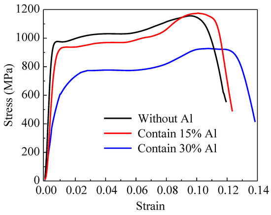 In the strain range of 0–0.01, the stress growth rate gradually decreases with the increase of Al contents, indicating that the presence of Al makes the specimen need more strain to achieve compactness. In the strain range of 0.02–0.08, the stress–strain curves of the specimens are relatively flat due to the significant thermal softening effect of Al that counteracted the effect of strain hardening [35,36]. Some studies [37] have shown that the plastic deformation of aluminum alloys at high strain rates is mainly characterized by adiabatic heating and shear strain localization.