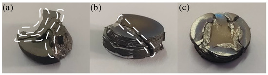 The fracture characteristics of the specimens with different Al contents impacted by SHPB are shown in Figure 4. For the specimen without Al (Figure 4a), the obvious brittleness fracture is occurred, and three cracks appear on the surface.