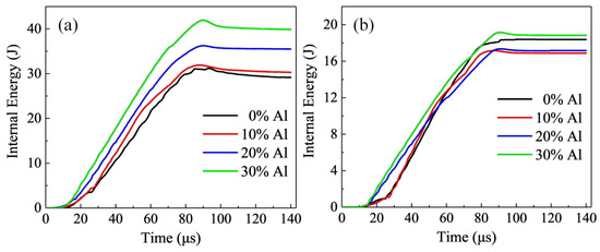 Figure 6a shows the energy variation curves of the specimens with different Al contents during the SHPB experiment. The time of 0 μs is the time when the incident wave just contacts the specimen. The total energy absorbed by the specimens with 0%, 10%, 20%, and 30% Al content is 29.03 J, 30.29 J, 35.49 J, and 39.88 J, respectively. It can be seen that with the increase of Al content, the energy absorbed by the specimen increases gradually. This indicates that the higher the Al content, the stronger the energy absorption capacity of the laminated composites. After the energy absorption reaches the peak, there is a small decline. This is due to the recovery of elastic deformation and energy release of the specimen.