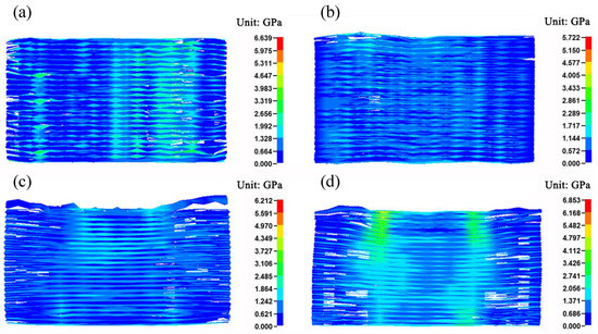 Figure 5 shows the simulated dynamic stress–strain curves of Ti–Al3Ti–Al laminated composites with different Al contents. The compressive strength of the material with 0%, 10%, 20%, and 30% Al content is 1166.0 MPa, 1181.4 MPa, 1025.2 MPa, and 913.3 MPa respectively, and the fracture strain is 0.090, 0.095, 0.113, and 0.145 respectively. For the Ti–Al3Ti–Al laminated composites with 10% Al content (Ti:Al3Ti:Al = 2:7:1), its fracture strain is greater than that of the materials without Al, and its compressive strength is the highest. It has a good balance between brittleness and toughness. When the Al content is 20%, the compressive strength of the material decreases by 13.2% compared with that of 10% Al, but the fracture strain increases by 18.9%. When the Al content increases to 30%, the compressive strength continues to decrease and the fracture strain continues to increase. Konieczny [38] also pointed out that the amount of residual aluminum on the intermetallic compound centerline increased the ductility of the composites.